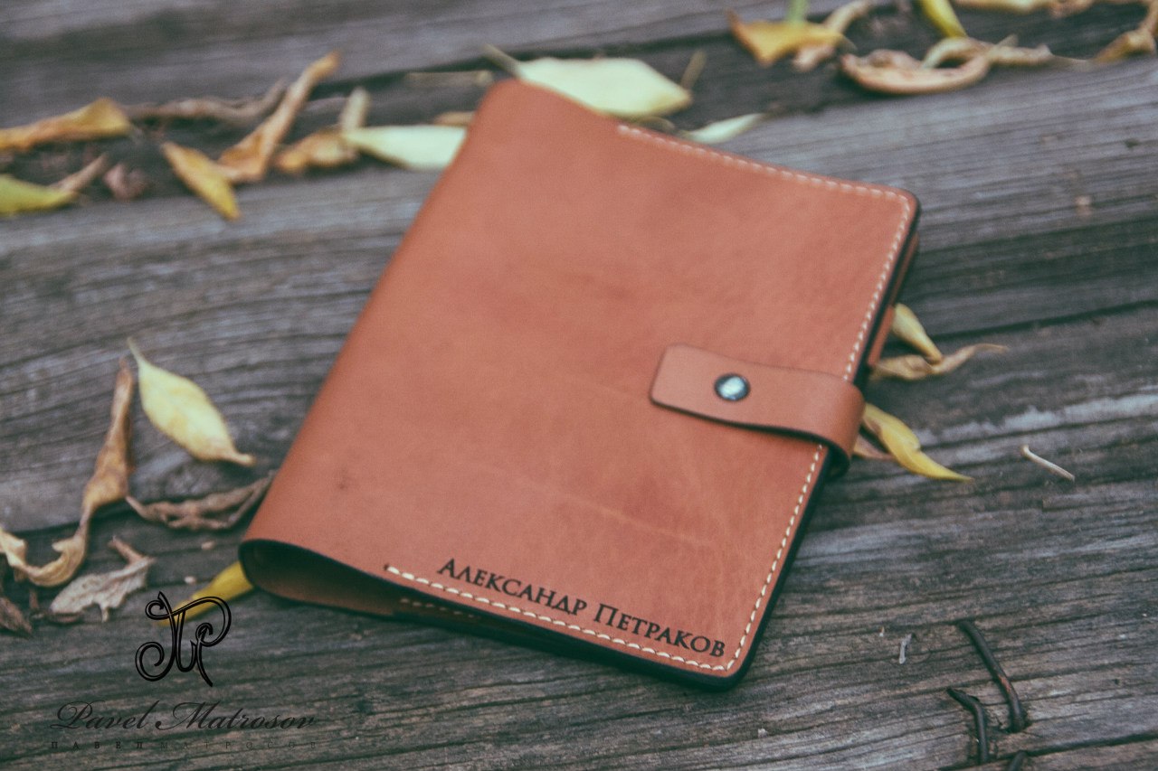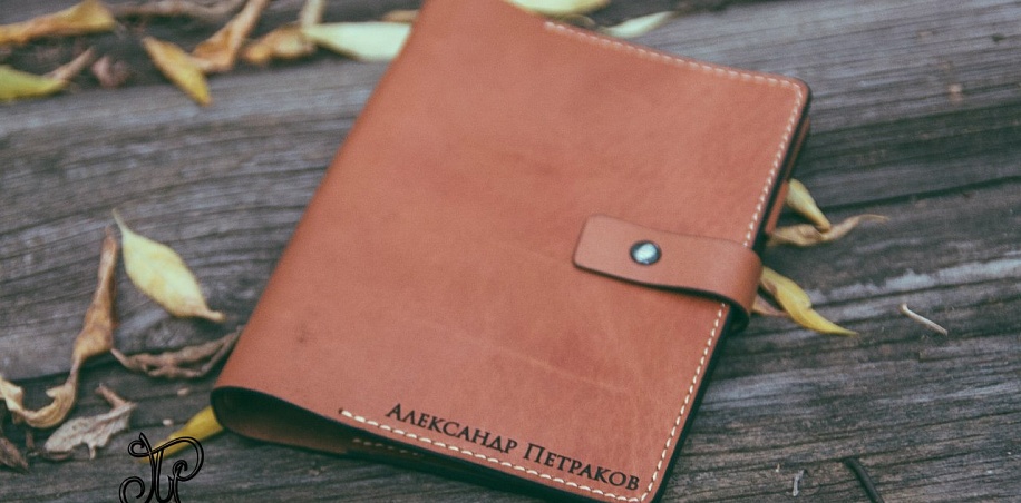 Тетрадь из натуральной кожи КРС, толщиной 2мм. Возможно нанесение вашей надписи, логотипа или инициалов. Тиснение на внешней стороне изделия это пример того как может выглядеть ваша надпись.