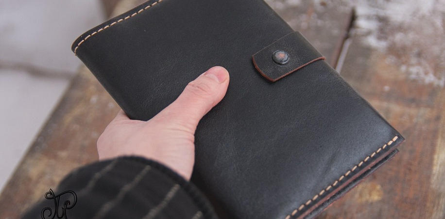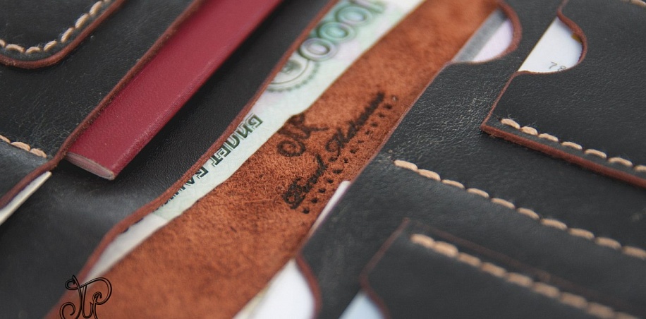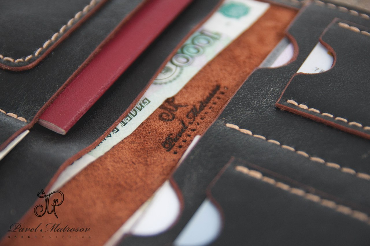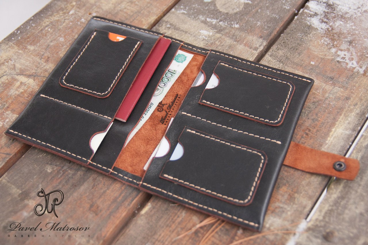 Портмоне выполнен из натуральной кожи КРС. Отделы: один отдел под паспорт, 3 отдела под карты, 1 под визитки, 2 отдела размером по тех паспорт и снилс и два под купюры.